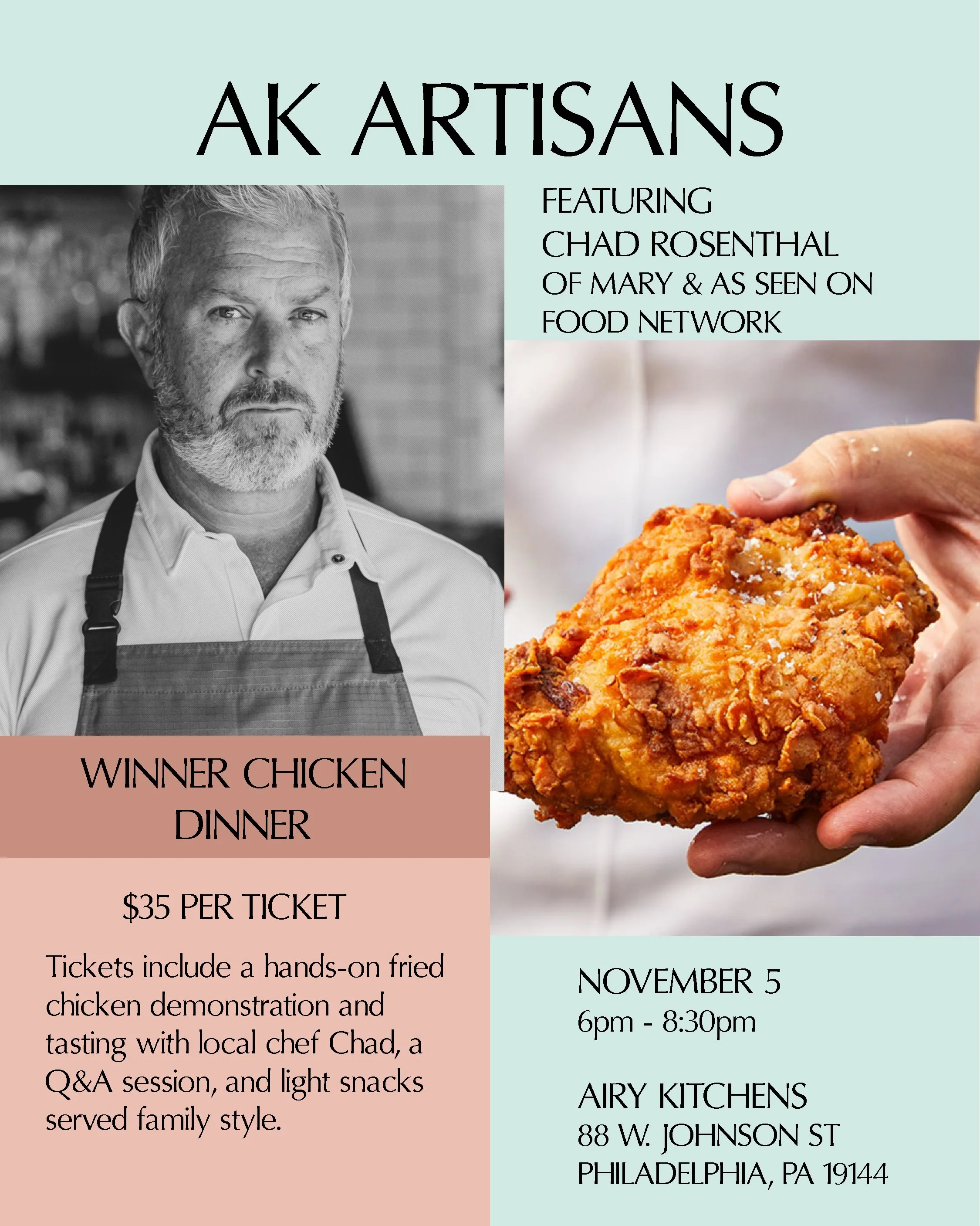 Learn how to make fried chicken with the chef who beat Bobby Flay! Join us on November 5th at the Airy Kitchens showroom for a hands-on fried chicken demonstration, tasting, and Q&A session. Chad Rosenthal is the owner of several local restaurants and has starred in Food Network shows like Beat Bobby Flay, Chopped Grill Masters, and Food Network Star.