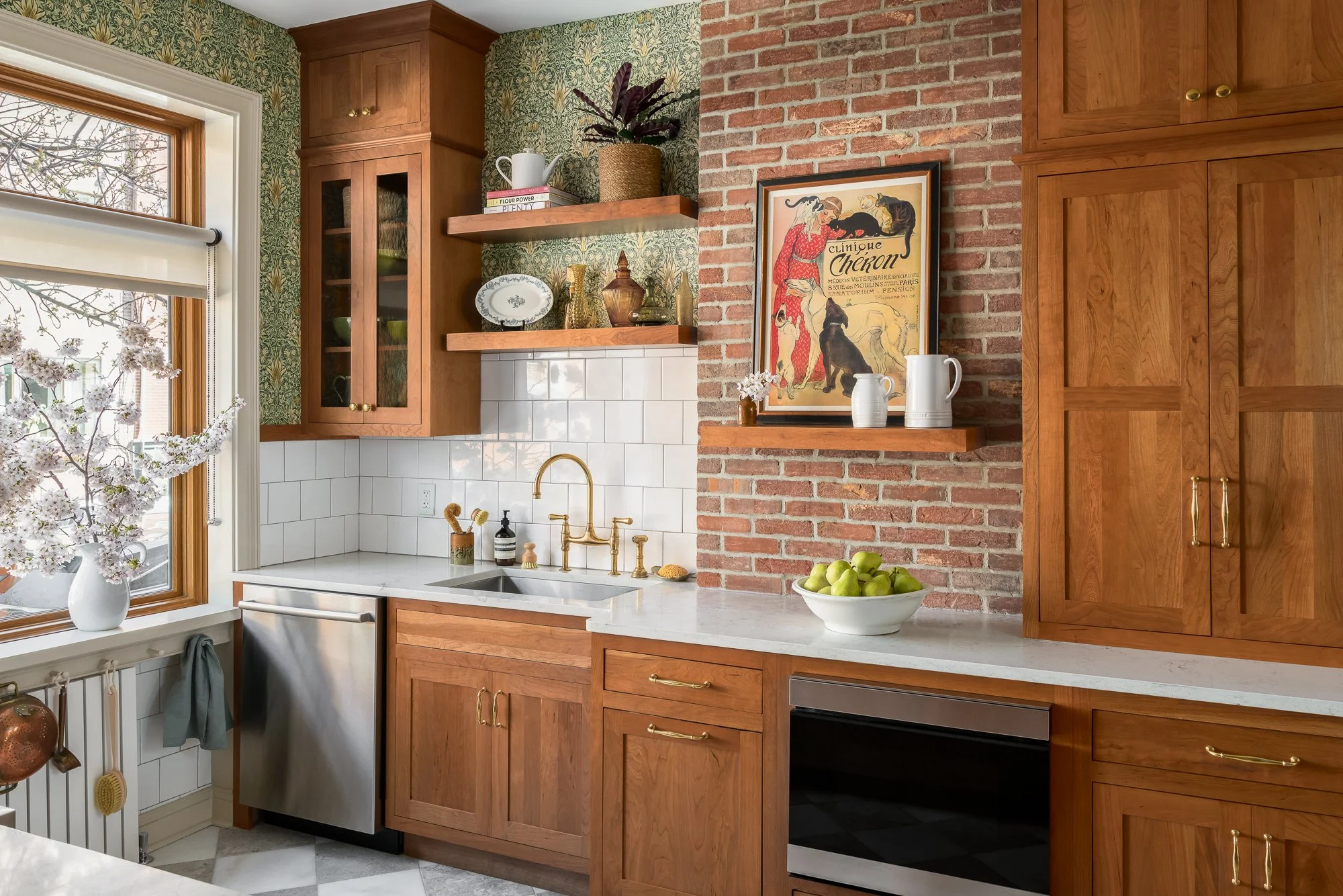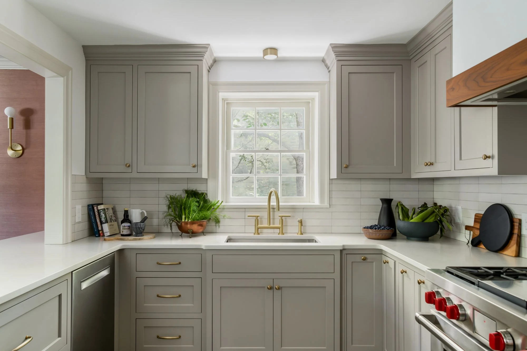 - Painted and stained wood finishes coordinated with countertops, appliances, and fixtures