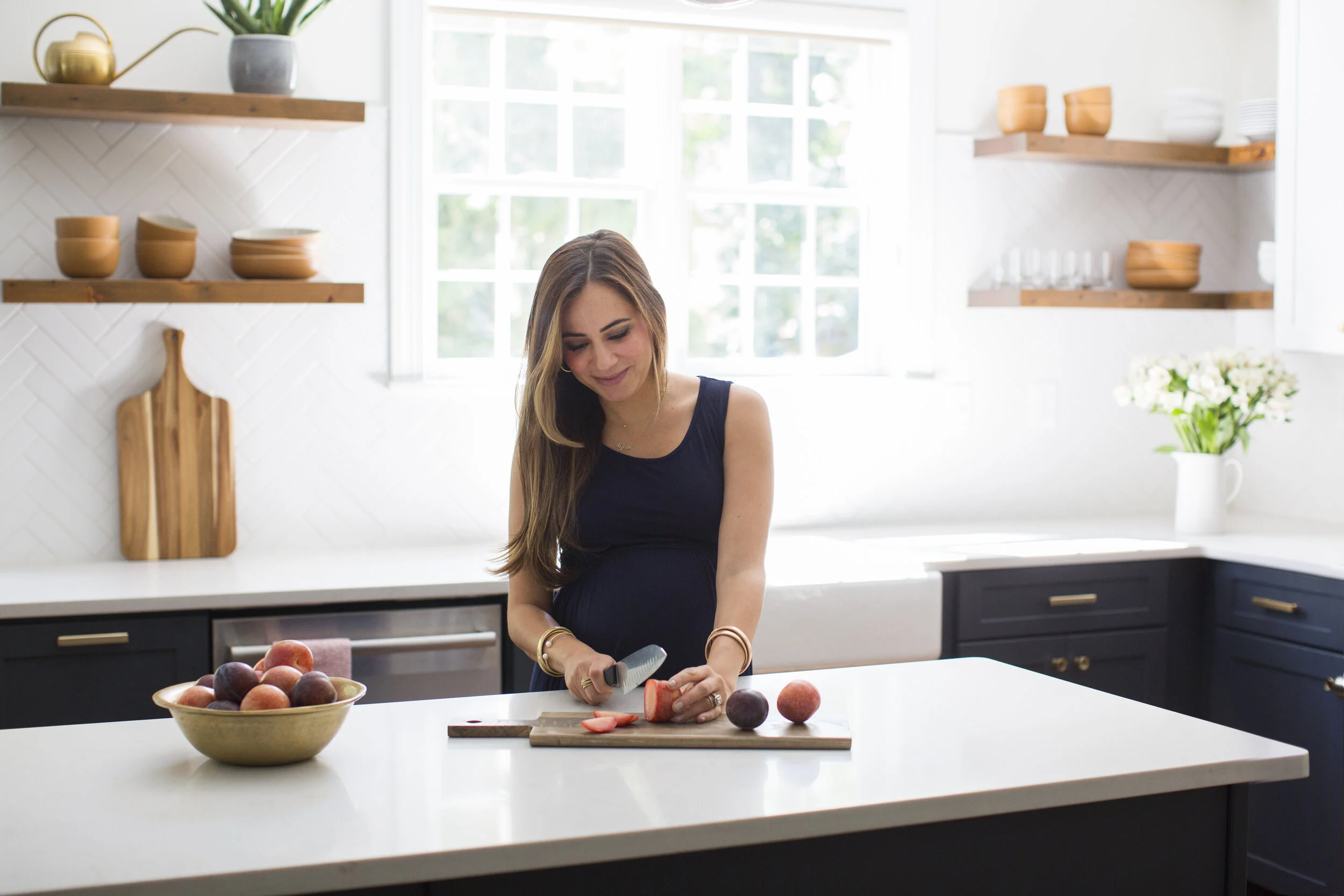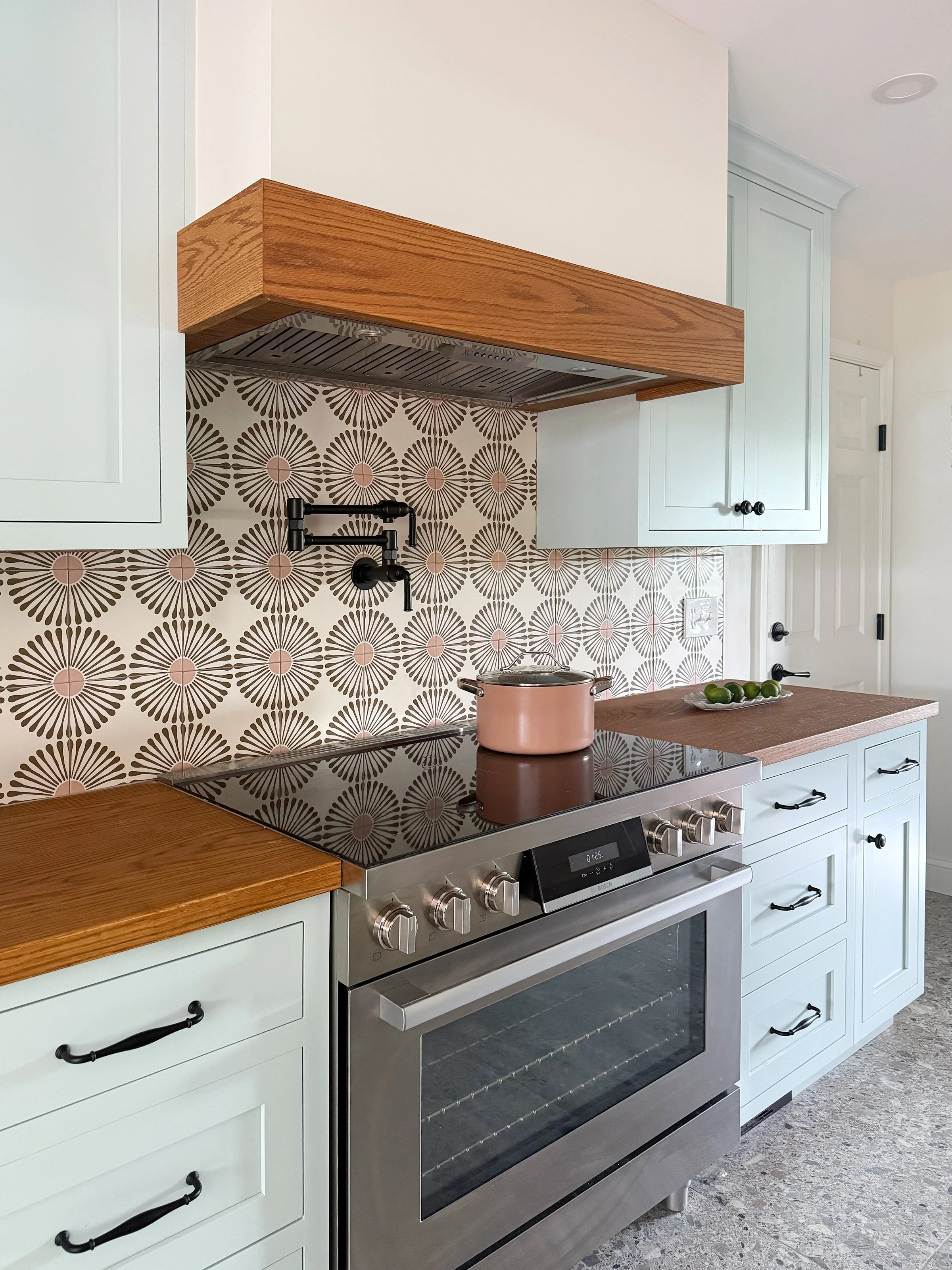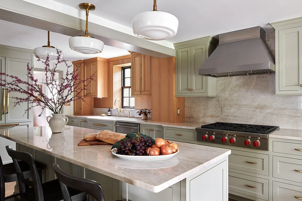 Butcher block counters add warmth to painted cabinets.